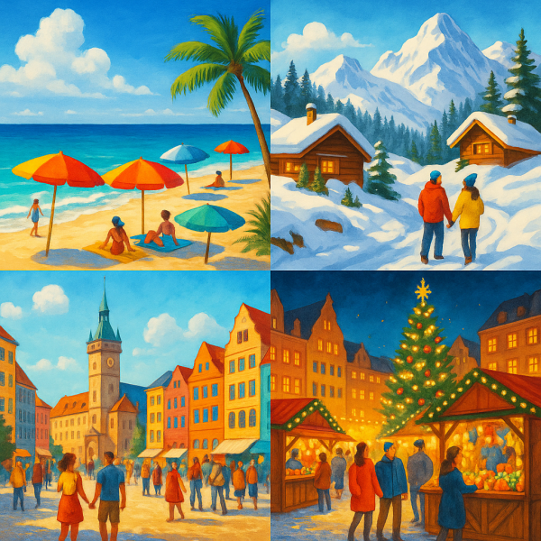 Découvrez des destinations idéales pour chaque période de l'année. En été, optez pour les plages de la Méditerranée ou les paysages montagnards des Alpes. En hiver, laissez-vous charmer par les marchés de Noël en Europe ou par les escapades dans des chalets douillets.